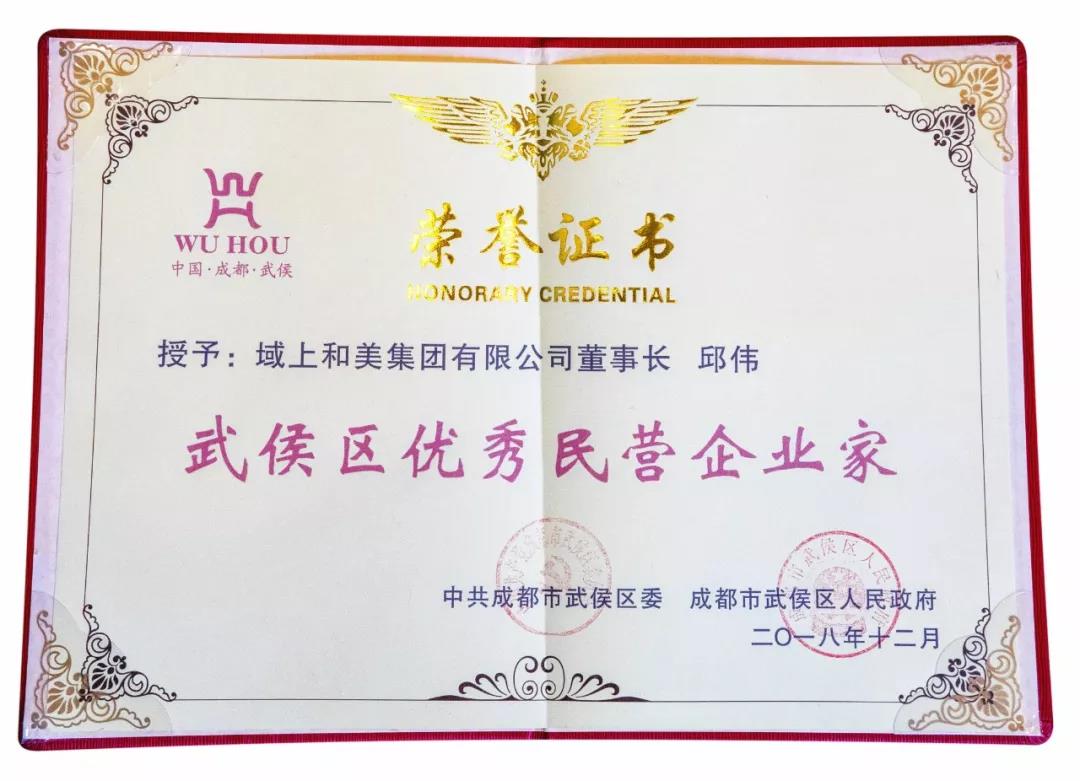 【转载】在12月11日召开的武侯区民营经济健康发展大会上,“2018年武侯区民营企业50强”、“优秀民营企业家”、“优秀创业者”名单集体发布,域上和美集团董事长、域上和美文旅股份董事长邱伟获评“2018年武侯区优秀民营企业家”。