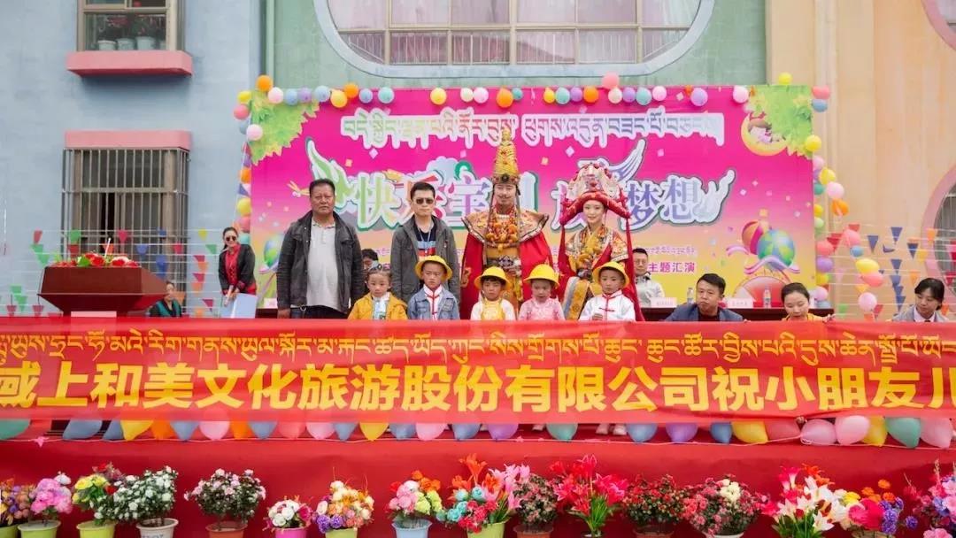 ▲《文》剧“公主”与“赞普”为慈觉林村城关区第十六幼儿园的小朋友们送上“六一”祝福